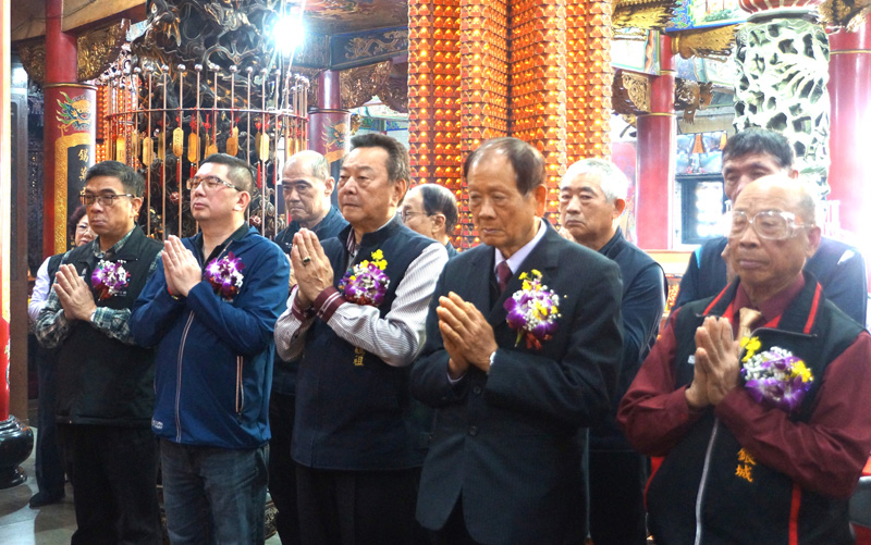 桃園慈護宮主委吳正宗(前右二)陪同金包里慈護宮董事長游忠義(前左三)率團隊、苑裡慈護宮主委鄭銀城(前)右一)率團隊、桃園區長許敏松(前左一)、龜山區長張嘉平(前左二)等人,於慈護宮向聖母媽祖上香祈福!(圖:記者徐玉英攝)