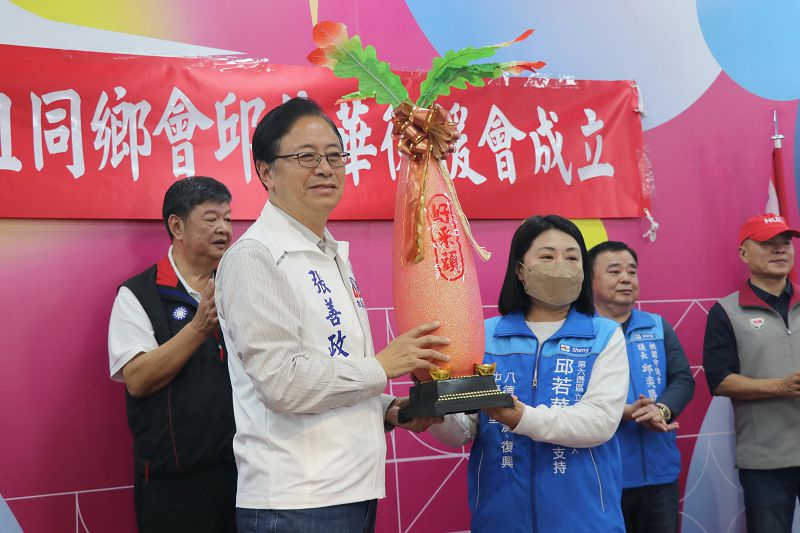 李四川特別致贈鐵鎚給陳若翠說,鐵鎚就是做工,代表市政建設,就像8年做不好的大巨蛋,他10個月就正式啟用,辦理比賽也沒有問題,傳承鐵鎚用意就是希望陳若翠進到國會爭取預算回來建設地方。