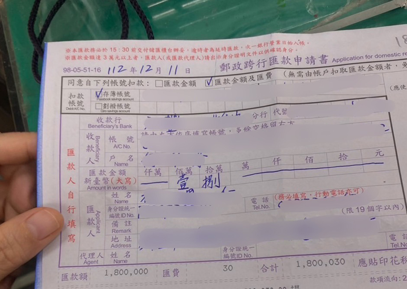男子郵局已寫好的匯款單,準備匯款時被機靈的行員通報員警到場。(警一分局提供)