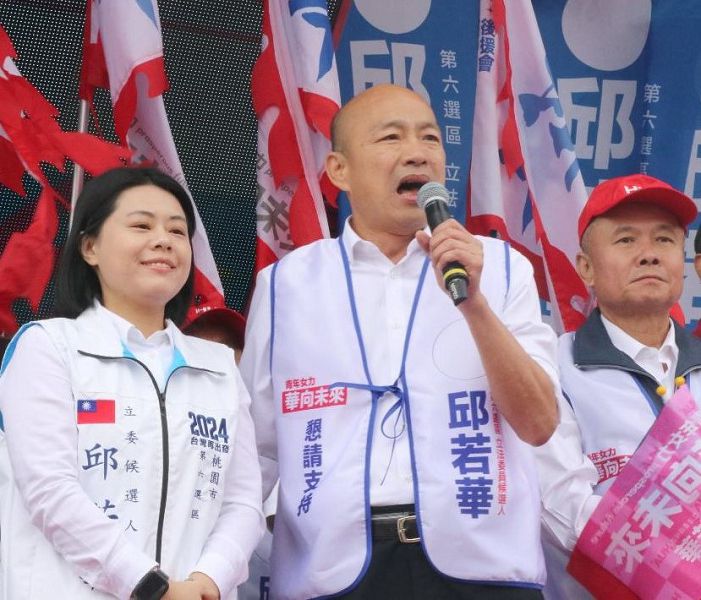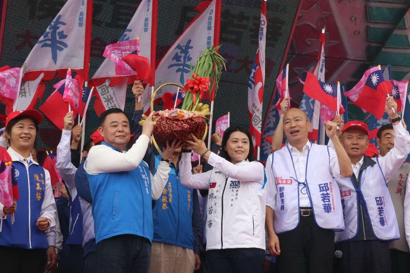 高雄前市長韓國瑜(右)為立委參選人邱若華站台助講。(記者鍾陽正攝)