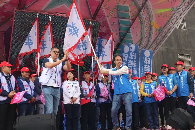 國民黨副主席連勝文向邱若華競選團授戰旗。(記者鍾陽正攝)