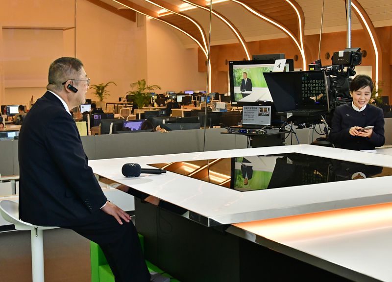 山本巿長(左)坐上每日播報新聞的主播檯,以簡短日語在鏡頭前體驗新聞播報的專業,參訪過程中更了解慈濟人傳揚美善的用心。