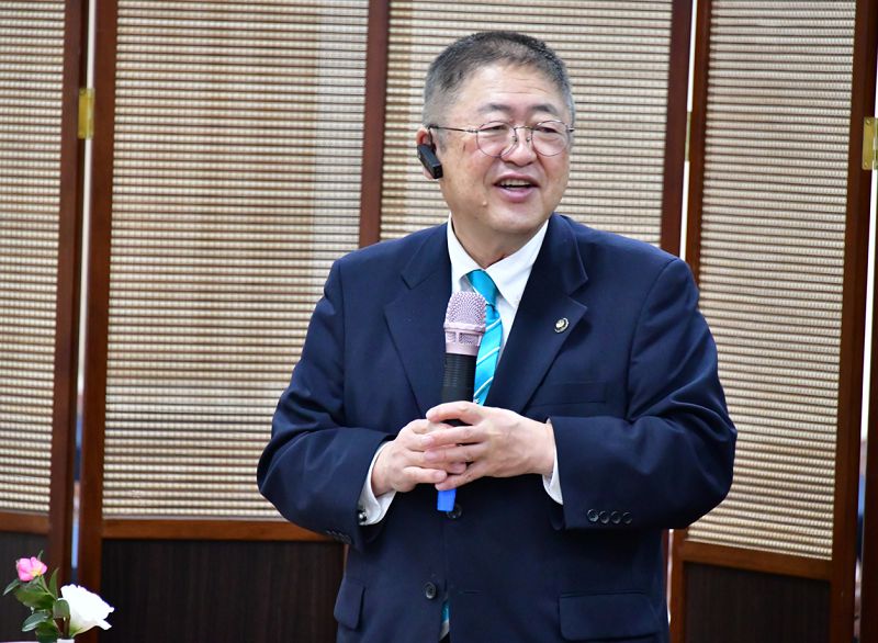日本岩手縣宮古市長山本正德走進台北關渡靜思堂,親切用「您好、您好」的中文跟大家打招呼,臉上堆滿親切的笑容。