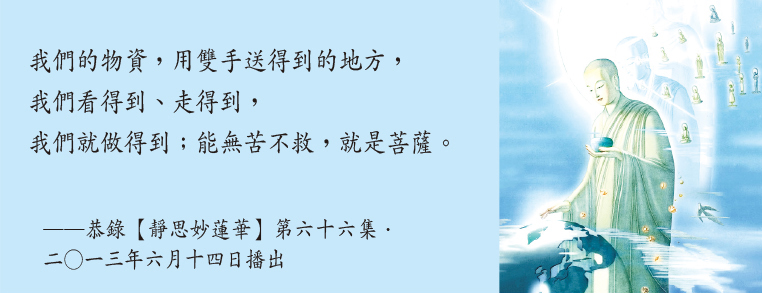 大愛無國界,天下災難、匹夫有責,雖然受苦的人處在悲悽中,有福的人卻能凝聚力量去幫助,但願全球的人都能將心比心,為苦難人善盡一分力量。能為人及時解難、給予膚慰和陪伴,這就是別人的貴人,同時也是有福之人。