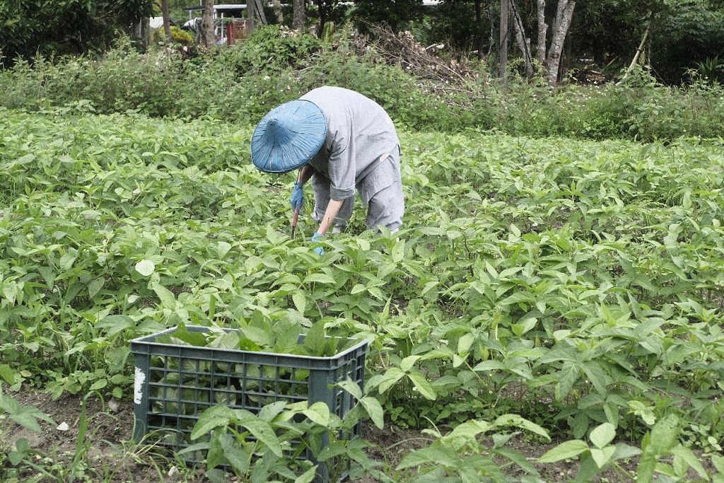 以自然農法耕種、不灑化肥的黃豆與黑豆田,靠的是師父及志工們的用心照護。為了給豆苗足夠的空間生長和吸收養分,就得勤除草。