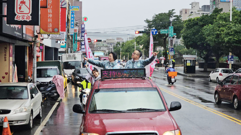 民進黨候選人鄭文婷在抽籤後,即由議長童子瑋及多位現任市議員陪同,冒雨站在車上陪同鄭文婷,一起掃街拜票。