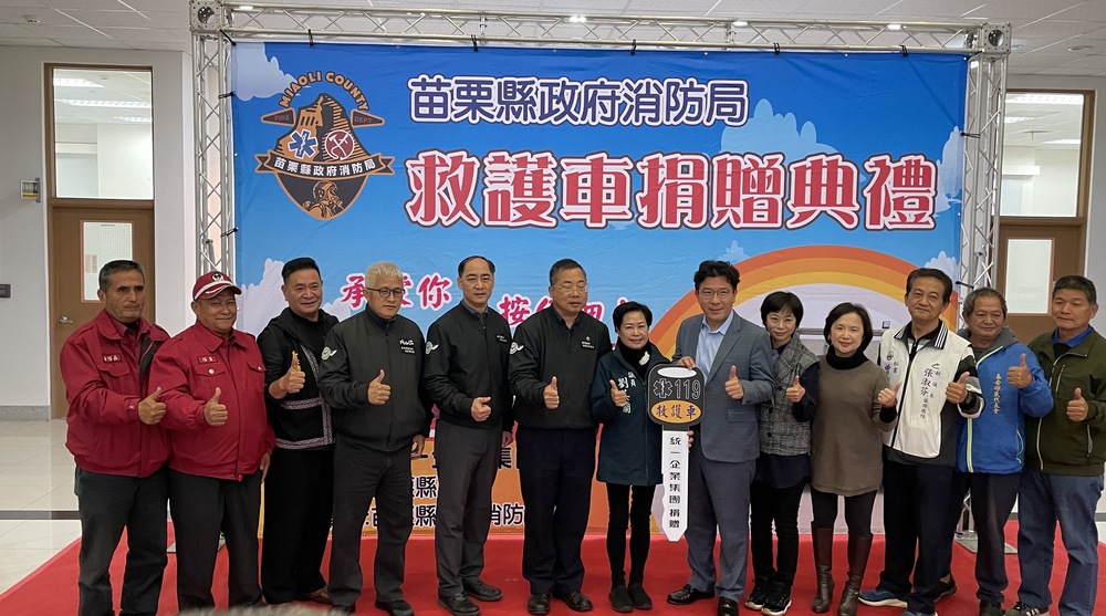 【記者林盈焜苗栗報導】統一企業集團致力社會公益不落人後,21日捐贈苗栗縣消防局1輛總值374萬元配備精良的救護車,將配發泰安後山的象鼻消防分隊緊急救護使用。統一集團發言人凃忠正率同經理劉瓊穗及超商公共事業部長李至和等幹部捐車,苗栗縣政府由秘書長陳山與消防局長匡夢麟代表受贈,並回贈感謝狀及紀念品,感謝企業熱心公益,提升偏鄉緊急醫療救護能力,守護民眾健康。