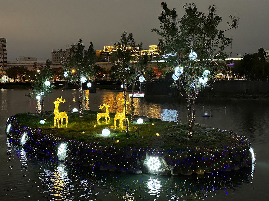 【記者彭勝郎台中報導】響應2023台中耶誕嘉年華,迎接耶誕週末假期,台中市政府建設局特別在東區「湧泉公園」及「台中公園」佈置應景的麋鹿小島、心心相印及星光步道等造型燈飾,及漂浮湖面的雙心雙色四季海棠等鮮豔蒔花,讓市民感受濃濃的耶誕節慶氛圍。