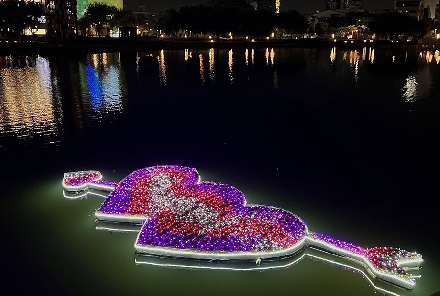 陳局長補充說明,台中公園是重要的觀光地標,園內的湖心亭不僅是市定古蹟,更是台中市的象徵,建設局此次於自由路與公園路口的廣場雙心花台,佈置「心心相印」的造型燈飾,搭配周邊步道以「星光月亮」點綴,點起百年公園溫暖心光的氛圍,營造浪漫的幸福台中城。
