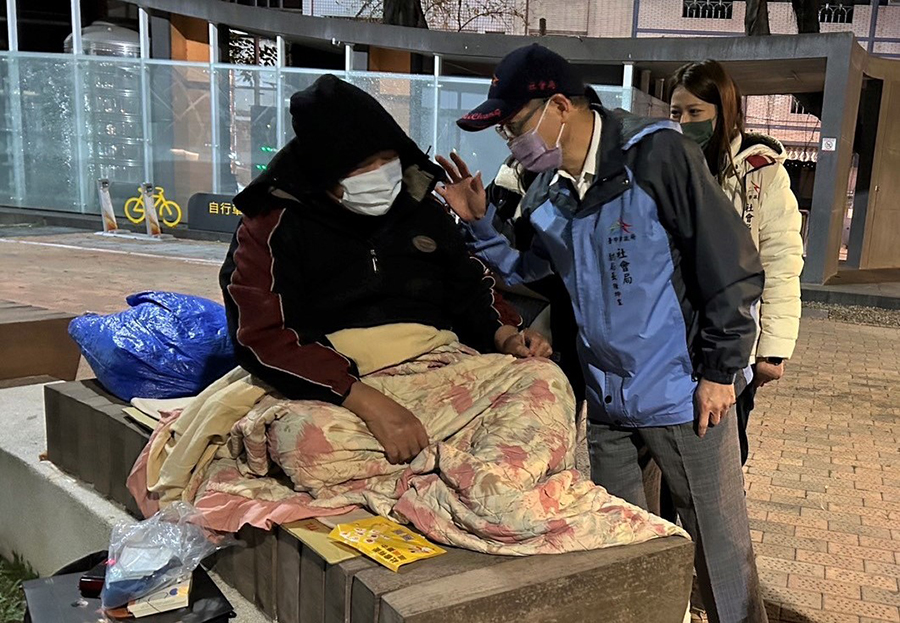 台中市社會局副局長陳坤皇與遊民小組,21日晚間至車站和公園等街友露宿區域關懷行動,並發放258人次禦寒物資,也關懷提醒街友天氣寒冷,務必做好保暖措施。