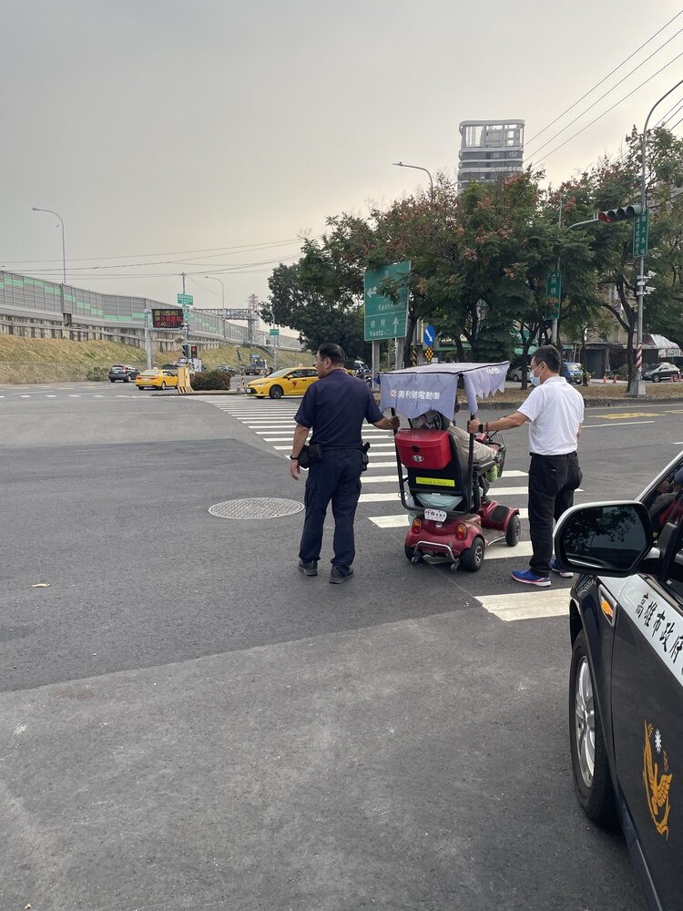 苓雅分局警備隊警員李家宏、李冠儒、行政組巡佐黃志雄、交通分隊小隊長熊旭東共乘警備車日前下午前往靶場常訓,訓練完畢返回分局途中,於高速公路涵洞下十字路口中央見一名老翁駕駛電動車無法動彈,並正逢下班時段車水馬龍,老翁十分無助、險象環生。警員李冠儒馬上下車疏導交通,配合警員李家宏駕駛警車停在老翁身後以防危險,巡佐黃志雄及小隊長熊旭東立即徒手推動電動車前往路旁安全區域。事後詢問老翁,稱電動車行駛至路口中央剛好沒電失去動力,原本想自己推到路旁,因為中風行動不便差點跌倒,幸好遇到警察前來幫忙,才得以脫困。員警合力將老翁及電動車推至附近統聯客運,客運人員協助老翁電動車充電,讓老翁可以平安回家。(圖文:記者張福全)