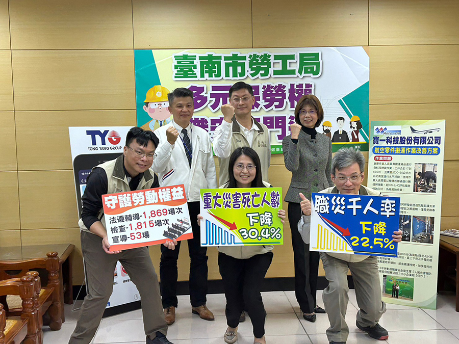 局長王鑫基進一步表示,職安健康處業務推動展現具體成果,經勞動部統計,截至今年11月底,南市重大職災死亡人數16人,去年同期為23人,較去年下降約30.4%;此外,南市職業災害千人率今年至9月底為1.448,去年同期為1.868,較去年下降約22.5%,顯示推動降災有所成效。此外,今年不僅職安健康處獲「勞動檢查機構年度績效考評」甲等榮耀,以及市府獲「112年度政府機關職業安全衛生績效良等獎」佳績,市內多家事業單位亦獲職安相關獎項肯定,包括「統一企業股份有限公司」、「大統益股份有限公司」、「奇美醫療財團法人柳營奇美醫院」獲頒國家職業安全衛生獎;「瑞鋒營造股份有限公司(曾文南化聯通管統包工程A3標)」、「台灣糖業股份有限公司休閒遊憩事業部柳營尖山埤渡假村」獲頒職業安全衛生五星獎;「統萬股份有限公司」、「久興國際工業股份有限公司」、「寶一科技股份有限公司」獲職場人因性危害預防優良實務案例競賽活動獎項肯定。