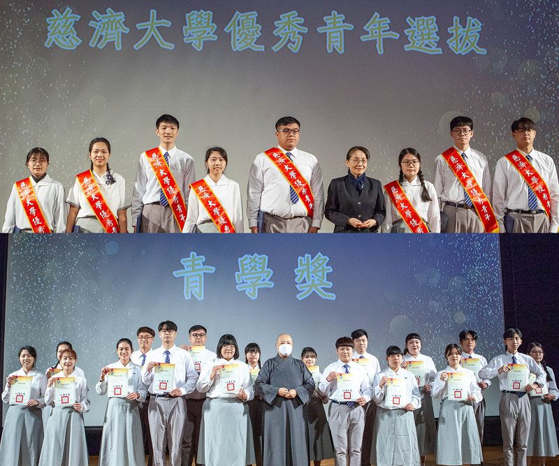 這在感恩時刻,頒獎給獲教育部青年發展署海外志工服務績優團隊優等獎的「慈濟大學服務學習國際志工團隊」、教育部112年教育業務志願服務獎勵青學獎及績優志願服務團隊。慈大今年有「公衛系衛了部落志工團隊」、「人醫-松浦文化健康服務」2團隊獲績優團隊之殊榮;青學獎得獎學生有鄭暐馨、張芮馨、葉庭均、吳采蓁、葉延盈、邱玟惠、黃美瑄、施禹全、史學承、吳梓盺、陳尹羚、周琨博、胡家瑄、杜瑋萍、林朋彬、吳芷昀、李詠慧、黃羽榛、吳宜臻、李炎輝、宋旻卉、廖彩媗、林繹嫺、李方筠、翁紹騰等25人,獲獎的同學們均至少連續服務2年以上,且服務時數累計達200小時以上,方能獲得此殊榮,許多同學目前仍持續在服務的崗位投入志願服務,所以這些獎項都見證了慈大學生在社會服務的長期投入,這也是慈濟大學連續四年青學獎獲獎比例佔全國一半以上。