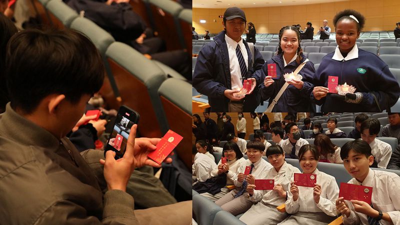 醫技系同學相約一起來參加典禮,林芳瑜同學表示,與大家一起上台領受上人的福慧紅包,感受到來自全球慈濟人的祝福,也許下願望希望明年的自己能更進步。國際數位媒體科技學程許多外籍生今天也是第一次參加歲末祝福,雖然只聽得懂部分中文,但他們深刻感受到典禮帶來的寧靜和平和,菲律賓蔡竹曄同學說:「透過大藏經讓我更認識慈濟,也讓我很感動慈濟所做的。」