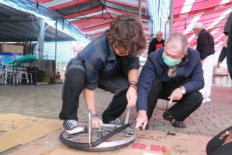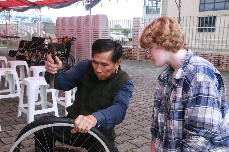 國際交換生親手為二手輪椅置換輪胎,許多學生首次拿螺絲起子、板手等維修工具,透過輔具平台的志工指導,很快將輪椅修理完成。墨西哥的洛文中(中文名)說:「我曾經在我們國家陪伴過交換生,也帶他們修理過輪椅,這是公益,可以幫助人的事,是很好的事。」