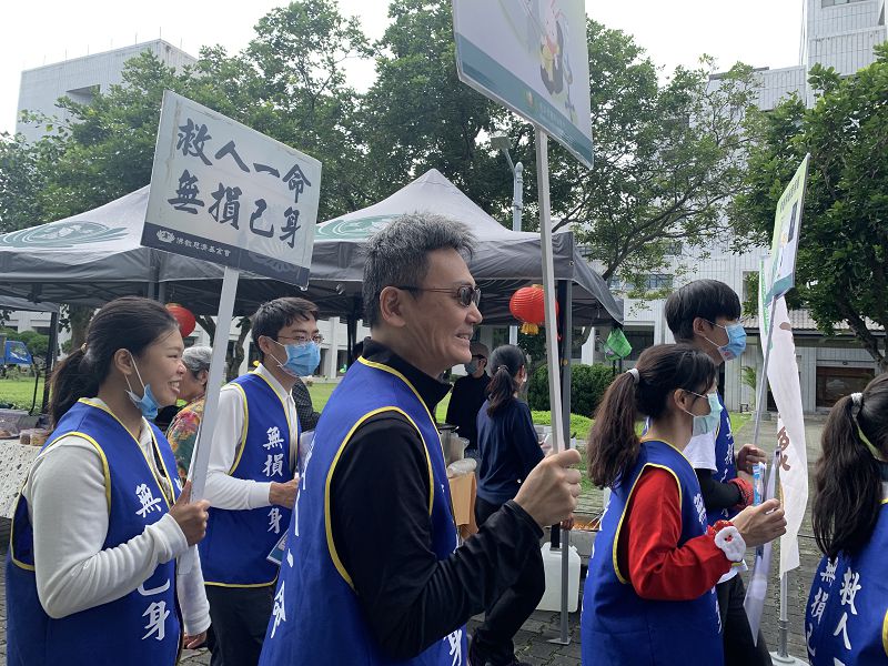 書軒小志工,今天也前來擔任造血幹細胞宣導志工,在人群中舉牌宣導造血幹細胞捐贈,其中,花蓮慈濟醫院心臟內科醫師張懷仁,也帶著全家一起走進市集舉牌邀約宣導,他謙虛笑稱自己是跟著孩子來當志工,也希望能號召年輕人把握機會來建檔。