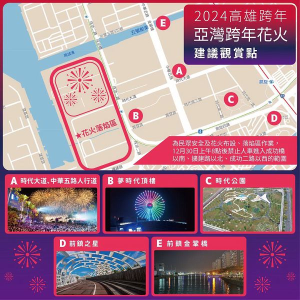 相較去年180秒,今年亞灣跨年花火時間更長、規模更大,最大8吋、超過7千發的高空花火,在會場周邊就能輕鬆觀賞,市府公開最佳觀賞點,有時代大道、中華五路人行道、金鞏橋及夢時代頂樓,其他建議觀賞點則包括時代公園及前鎮之星等。市府強調,為了民眾安全及花火布設與落焰區的作業,12月30日上午8點後將禁止人車進入成功橋以南、擴建路以北、成功二路以西的範圍,跨年花火施放當下也請民眾不要靠近。