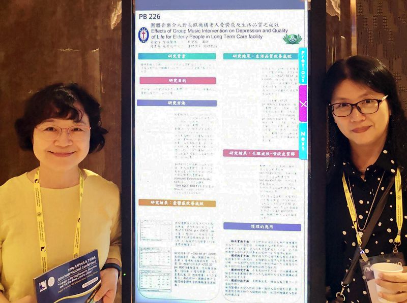 慈濟大學護理系的陸秀芳老師與其研究生俞愛玲老師與羅淑芬老師,對這個問題非常的關心。因此她們展開了一個研究來探討在養老院的老年人參與音樂治療團體活動對他們的憂鬱症狀及生理壓力的影響。這項研究的對象是居住在養老院的老年人,平均年齡為80歲,標準差為7.35歲。採用隨機對照試驗的方法進行,參與者被分為兩組:一組進行音樂治療,另一組作為對照組沒有接受任何音樂介入。他們在養老院中的平均住院時間,音樂組的平均住院年數為3.16年(標準差3.26年),對照組則為2.49年(標準差3.20年)。參與的老年人主要是因中風、半身不遂或全身不遂以及其他慢性疾病而無法自行照顧自己的病患。養老院為這些老年居民提供了護理服務、日常照料、管路更換、身體清潔等常規服務。