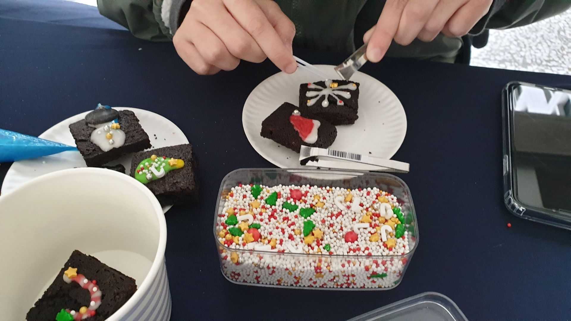 馬來西亞楊沚惠同學帶來好吃的布朗尼,這是他高中時學的,因為覺得很美味,所以就把食譜記下來。數媒學程艾琳表示,由於「餐飲英文」這堂課有很多國際生,所以可以與其他同學一起分享不同國際的食物文化,透過餐飲英文,他也學會很多不同廚房工具的英文和使用方法,讓她覺得非常有用。