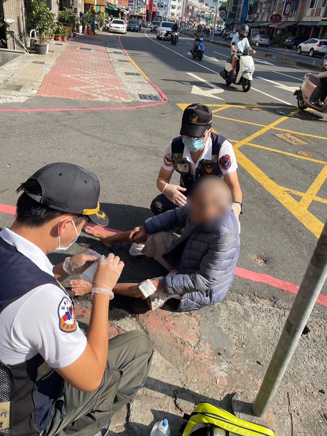 苓雅分局三多路派出所副所長丘國正、警員陳虹羽日前午後獲報,捷運技擊館站出口前有一老翁倒在地上,警組立刻趕往了解。員警到場時見一老翁神色痛苦、臉色發白地平躺在地上,副所長丘國正、警員陳虹羽警覺狀況不對,立刻上前關心老翁狀況。原來94歲的趙姓老翁中午獨自外出,欲步行至附近醫院看診,行經捷運技擊館站時,疑似因年邁體力透支而倒在路旁。員警趕緊通知119救護人員到場將老翁送往醫院就醫,並協助通知媳婦朱女到場陪同,家屬十分感激警方機警發現狀況不對,讓老翁及時獲得協助。【圖文:記者張福全】