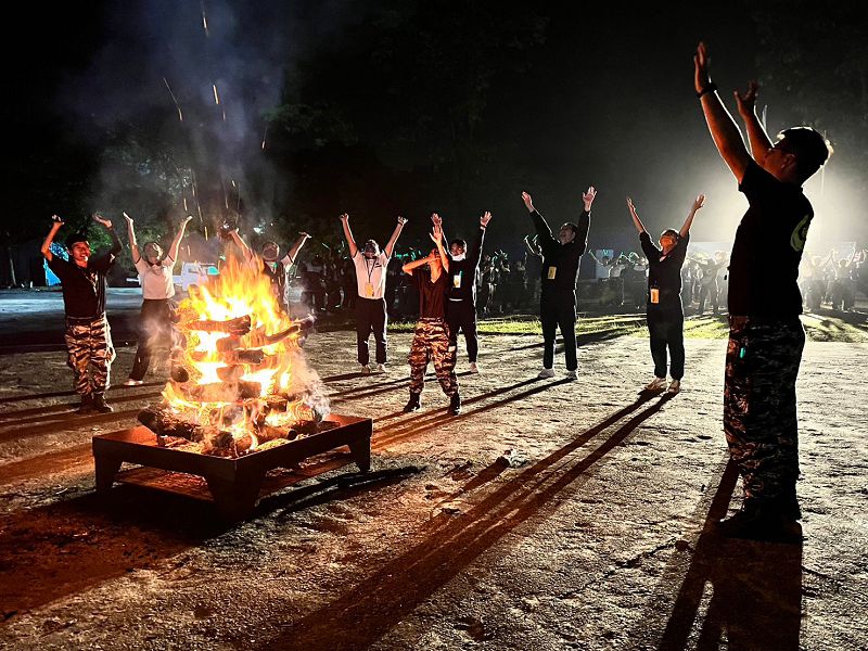 營火晚會累績了同學們高昂情緒,加上是一整個下午公民訓練的驗收成果,原本同學們疲憊的身心在學務主任點燃營火時,瞬間一掃而空,再加上導師群們跟隨主任帶領所有同學開場營火舞,取代而來的是,比白天更勝一籌的活力與歡騰,只見天空引爆了繽紛的煙火,全場各分隊熱烈整齊的隊呼與動作,都展現出團隊一心的競爭力,與年少青春的熱情瀟灑。