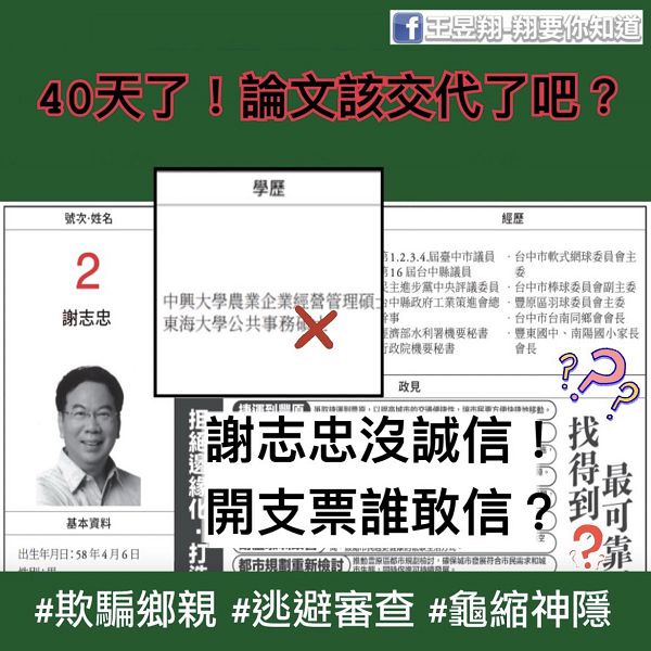 反駁惡質選風,江啟臣服務處發言人王昱翔回應抹黑時,更拿出選舉公報,質問學長謝志忠:「從11月15日迄今超過40天了」東海的學歷是不是造假?當初說要自請調查,論文送審了嗎?抄襲部分講清楚了沒?賴清德說好的高標學倫呢?論文抄襲不說清楚,還敢列上選舉公報,不就是公然的偽造文書?這就是民進黨的誠信,這就是謝志忠的道德標準,這就是民進黨推出的「美德」?
