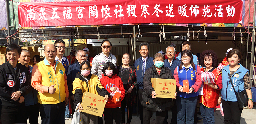 南崁五福宮關懷社稷歲末寒冬送暖活動由該宮提供每戶2000元紅包,五福宮慈善會長周秀蘭捐助葵花油、醬油、餅乾、麵條、泡麵、餅乾、雞腿便當等物資,給予中山、五福、瓦窯、吉祥、羊稠、長壽、福祿、營福、營盤、正興、南崁、南榮、南興、順興、福昌、福興、興榮、錦中、錦興、蘆興、山腳、外社、坑口、坑子、海湖、濱海、山鼻、內厝、長興、蘆竹、大坑里、南上里、南美里、三石里、果林里計700戶蘆竹區公所列冊之低收入戶。