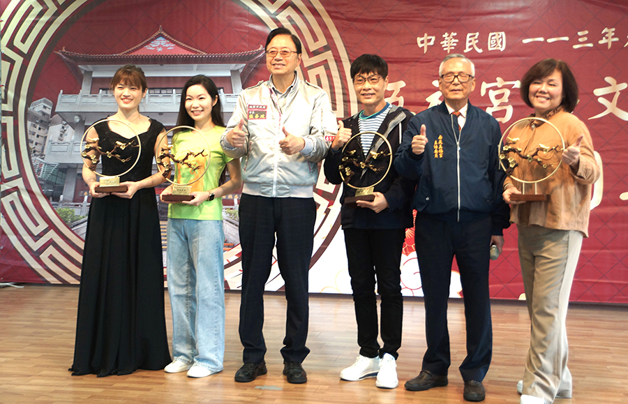 圖5:桃園市長張善政(左三)、南崁五福宮主委陳宗賢(右二)頒獎獎勵為南崁五福宮藝文中心活動之有功人員。(圖:記者徐玉英攝)