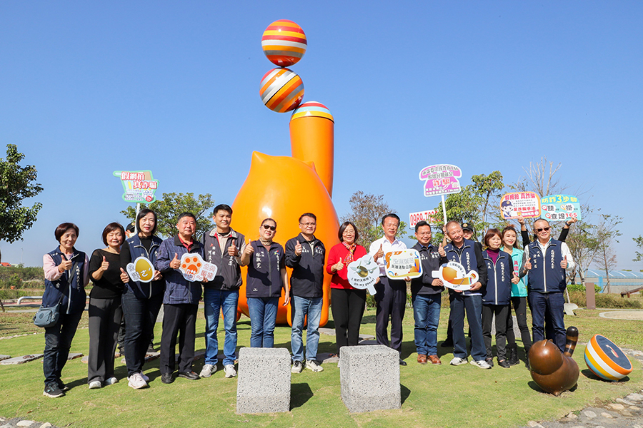 鍾偉光作品「律動喵喵」(My Dear Kitty)是一座橘色大貓咪雕塑,以民雄舊名「打貓」為靈感,球型尾巴在風中轉動,造型靈動。