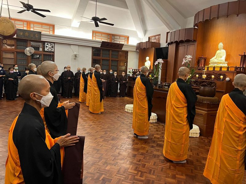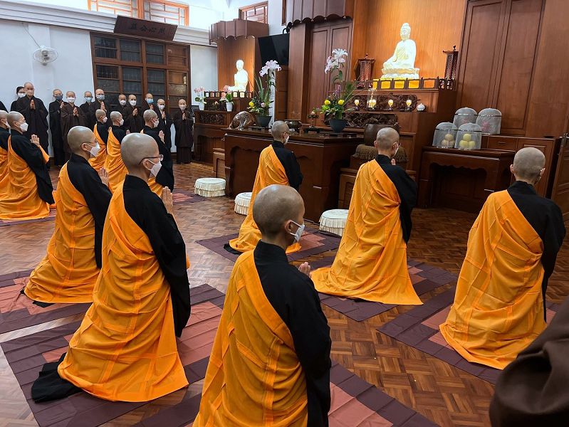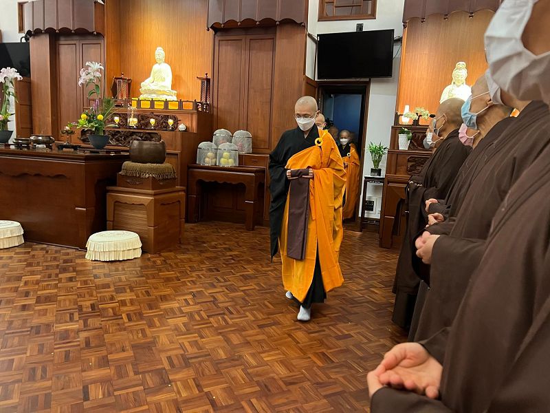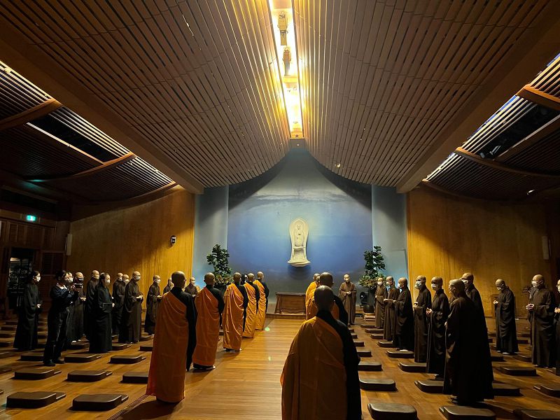 白天天氣陰晴不定,到了晚上忽然下起雨來,有如為戒子們洗塵般。八點不到,大殿燈火通明,佛龕前燭光搖曳生輝,上人專用的兩個拜墊,一前一後安置在佛桌前正中央位置,氣氛莊嚴。東西班兩側,已有許多穿著海青的常住師父、近住女、清修士及身著「藍天白雲」的志工,等著新戒子回來,並觀禮其向佛菩薩銷假展大具的儀式。