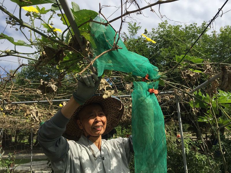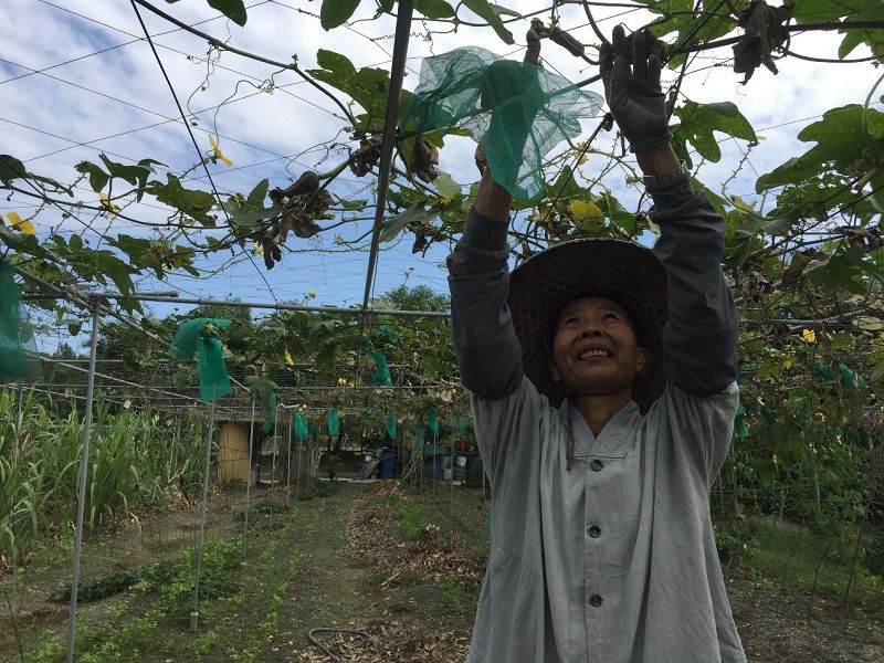 授粉之後的絲瓜花,需要以紙袋或網袋形成保護膜,否則被蜜蜂叮咬之後,剛長成的小小絲瓜就會生病、潰爛,從此曇花一現,告別美麗的世界。