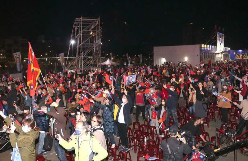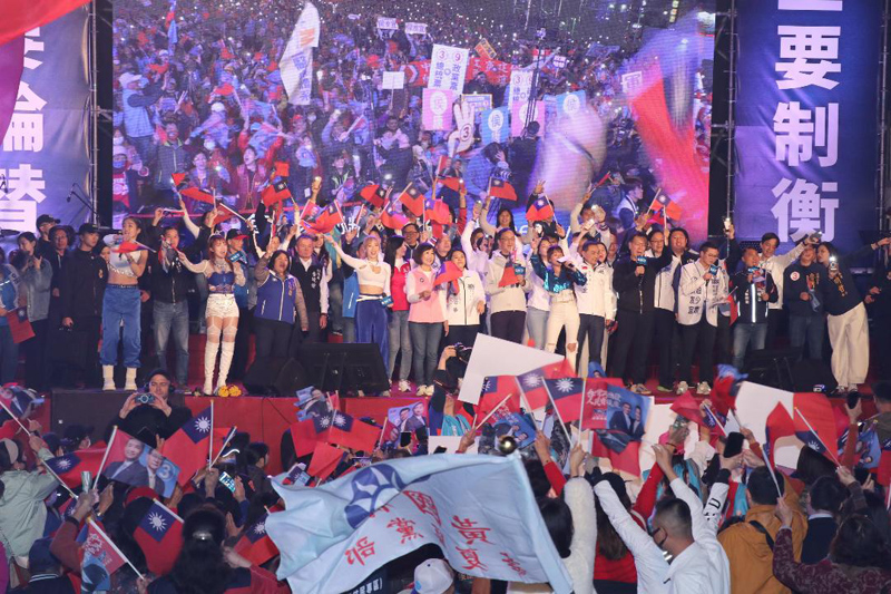 【記者鍾陽正桃園報導】2024總統大選進入決戰黃金週,國民黨正、副總統候選人侯友宜、趙少康於6日晚間在桃園競選總部舉行「團結勝利大會」造勢晚會,藍營大咖齊聚力挺,包括國民黨主席朱立倫、榮譽主席吳伯雄、不分區立委候選人韓國瑜、柯志恩、謝龍介、台北市長蔣萬安、桃園市長張善政、桃園市議長邱奕勝、前桃園縣長吳志揚、桃園六位立委候選人及桃園市議會藍營議員等力拚團結勝選。現場支持者塞爆10萬人,不僅會場被塞爆,連一旁部分封路區域都被人群坐滿,大家手拿著國旗熱情搖旗吶喊,凍蒜聲不絕於耳,氣勢如虹。