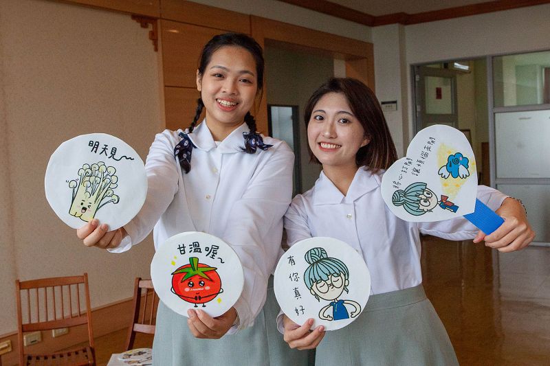 多數以人物為主的慈大line貼圖比賽中,傳播系葉延盈的「菜菜花園」呈現另一種風格,蔬菜都賦予了生命和情感,展現出蔬菜各自的“性格”,例如代表「明天見」的金針菇,還有辣椒代表「大膽」火爆脾氣。葉延盈表示,會創作蔬果貼圖除了在日常聊天中增添趣味外,也提醒大家要珍惜大自然的恩賜,對所有生命的尊重和珍視。