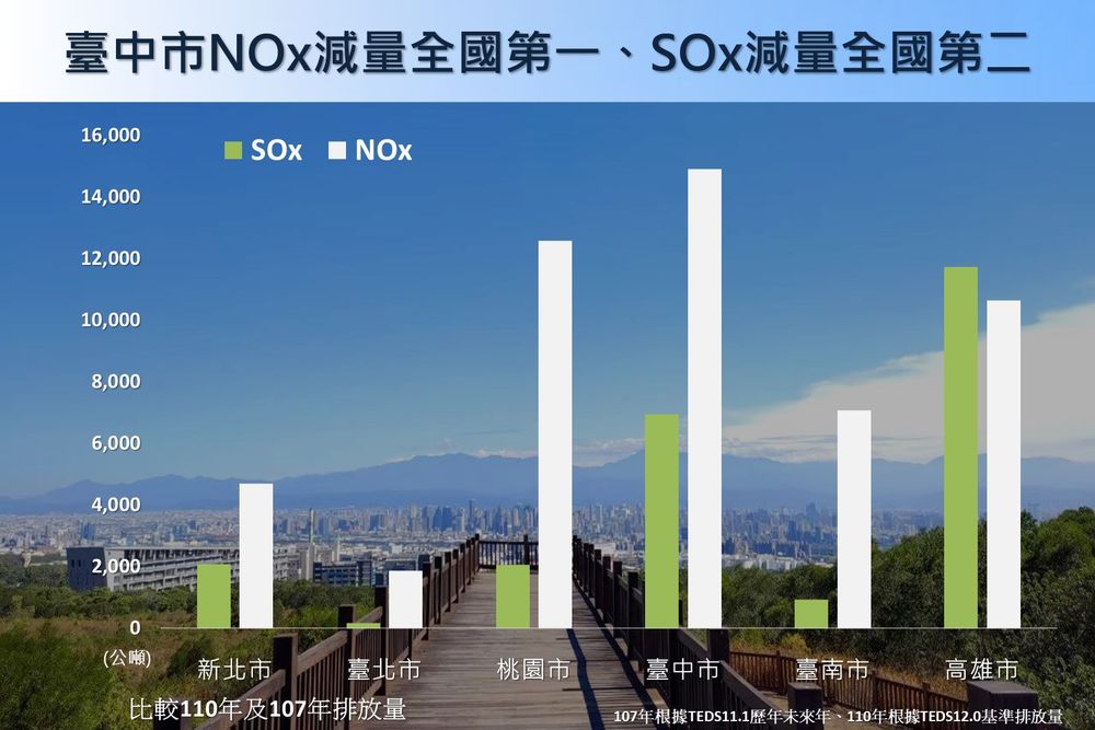 台中市政府環保局表示,依據國家空氣污染排放清冊(TEDS)統計資料,台中市氮氧化物及硫氧化物排放量分別由107年4萬4,142公噸、1萬7,701公噸降至110年2萬9,228公噸及1萬764公噸,氮氧化物減量全國第一,硫氧化物減量全國第二,改善幅度約34%及39%。