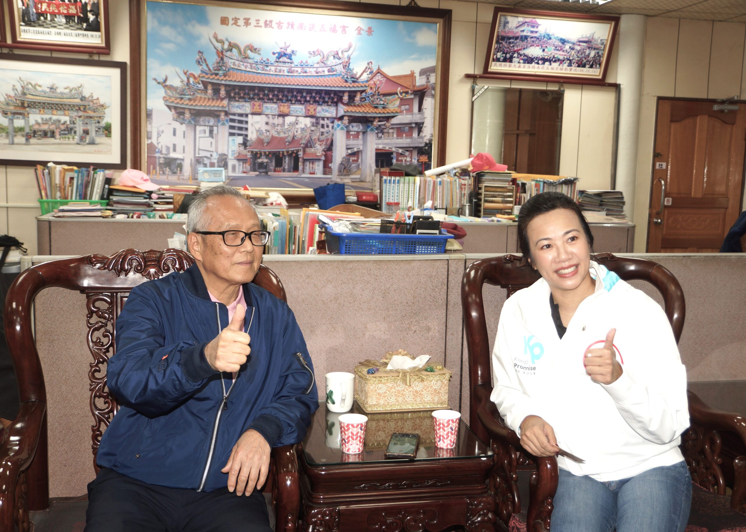 邀請吳欣盈至辦公室坐在「坐過都當選」幸運椅上閒話家常 認為她聲勢不容小覷