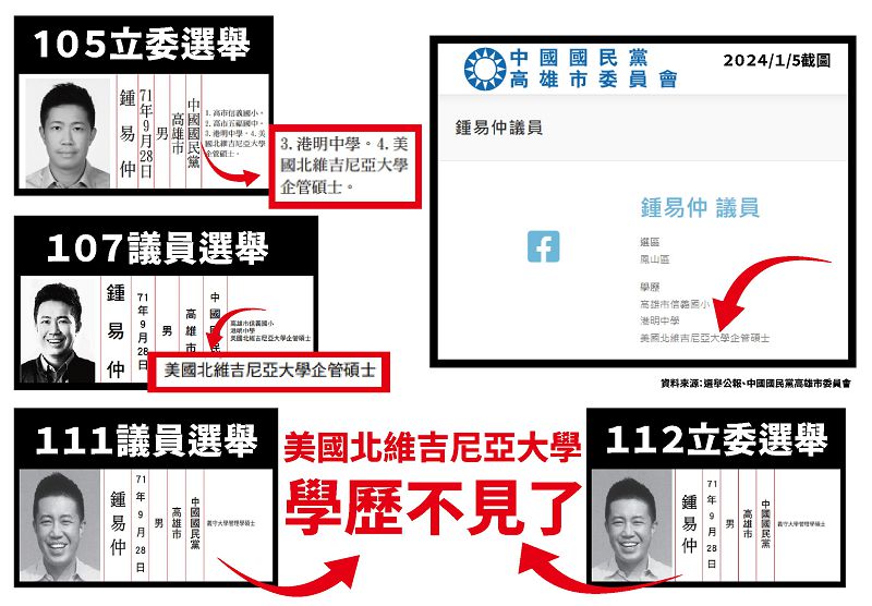 張漢忠議員表示,鍾易仲2016年立委及2018議員選舉公報,都有刊登此學歷,但這次選舉因為過去一年的學倫爭議,鍾易仲就不敢申報此學歷,顯見其心虛。蘇致榮副主任則表示,教育部國際司並不承認這所學校學歷,呼籲鍾易仲拿出他的出入境資料和念書時的紀錄,「你在美國有沒有可以作證同學? 」因為鍾易仲持此假學歷,歷任公職甚至教職,甘為該所假大學的詐騙共犯,當起詐騙學校的樣板,也間接造成更多年輕學生被這間假大學受騙。