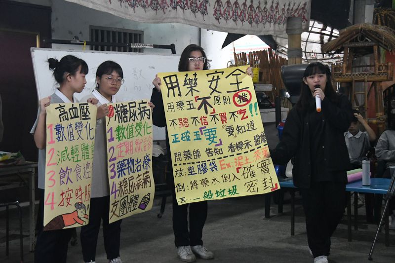 護理科四年級學生趙媛亘表示,長輩可能有高血壓、糖尿病等好幾種疾病,所以,得事前做足功課,以免傳遞資訊錯誤。加上社團裡也有一、二年級的學妹,大家一起找文獻,分享所學,相互討論,並激盪創意,一起設計出衛教宣導的腳本。