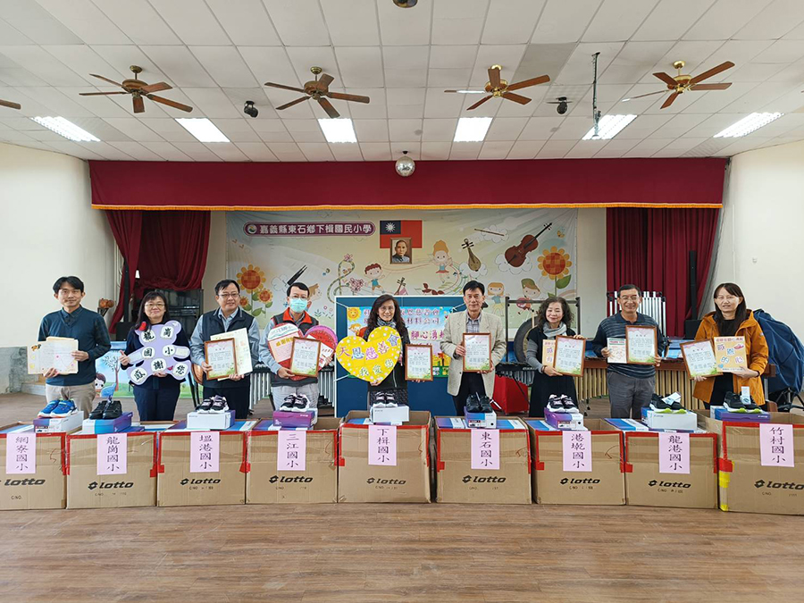 【記者謝敏政嘉義報導】社團法人天恩慈善會、瑞大鴻科技材料股份有限公司、信意企業股份有限公司及立光化工股份有限公司聯合辦理「嘉義縣東石鄉暨朴子市溫暖從腳心湧起贈鞋」活動,12日在東石鄉下楫國小舉行捐贈典禮,致贈9所學校弱勢學童一雙新鞋,每校各20雙,共180名學子受惠。