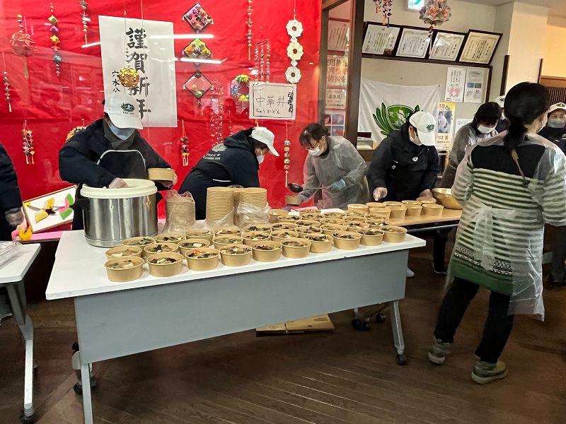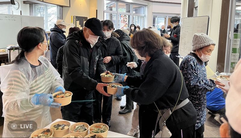 慈濟1月13日在日本能登半島地震的重災區石川縣北部的穴水町備妥發放約300人份熱食。志工共用廚房場地不大,但在分工合作後都能克服場地限制困難,希望能讓災民於寒冬中有溫暖的熱食可暖身與暖心。