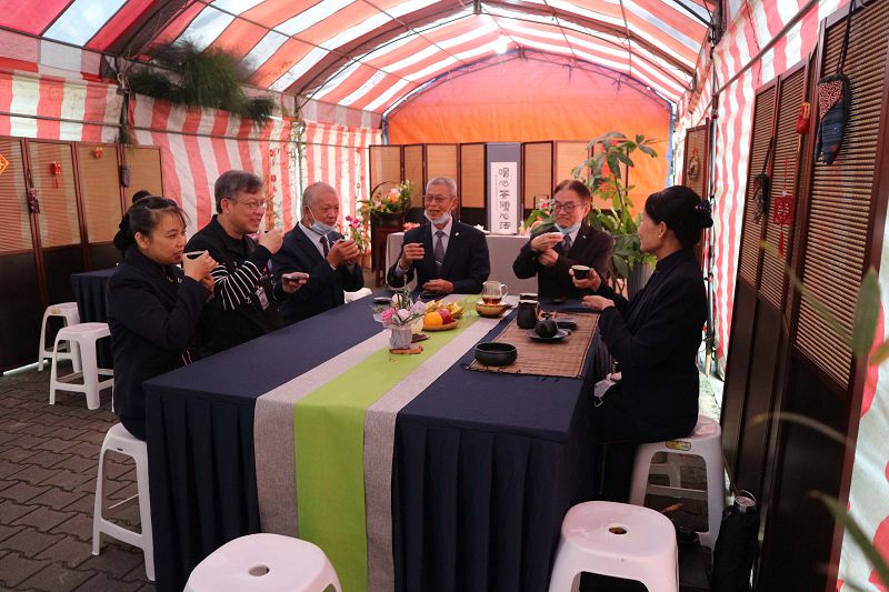 除了喜氣洋洋的攤位,中壢志業園區的外場還有一處靜思茶道的茶席,由具備靜思茶道師資的慈濟志工於此執壺,邀約路過的鄉親坐下來好好喝茶、靜心,慈濟志工鍾新蘭表示,這次是中壢志業園區在歲末祝福時第一次設置正式茶席,整體環境、茶席規劃布置,都由靜思茶道的老師們親自執行,例如屏風上一隻隻由拼布製作而成的蟬,也是老師們自己製作,其寓意就是六度波羅蜜當中的「禪定」,6、7兩日也是由茶道老師們駐站,為大家執壺、奉茶。
