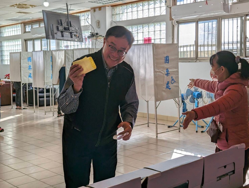立委候選人鄭文婷早上八點,就到戶籍所在地的仁愛區公所七樓,搶頭香來投票。她說,前一天晚上睡得很好,在議長童子瑋陪同下,投下自己的一票。