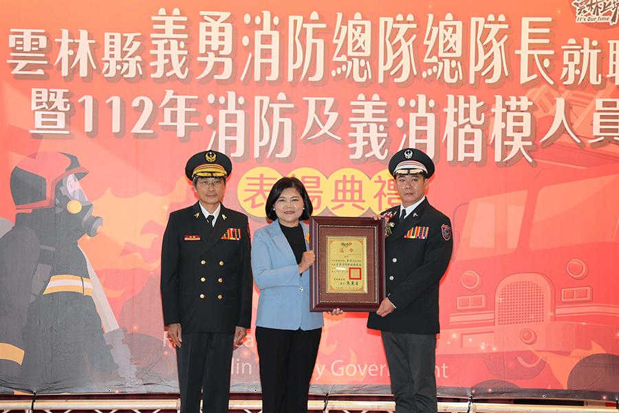 【記者雷琇雯雲林報導】「雲林縣義勇消防總隊總隊長就職暨112年消防及義消楷模人員表揚典禮」14日上午在雲林縣消防局大禮堂舉行。雲林縣長張麗善頒發議長黃凱「雲林縣義消總隊長聘書」,並表揚今年度消防及義消楷模合計57人,代表雲林鄉親感謝全體消防及義消們共同努力的辛勞與奉獻。