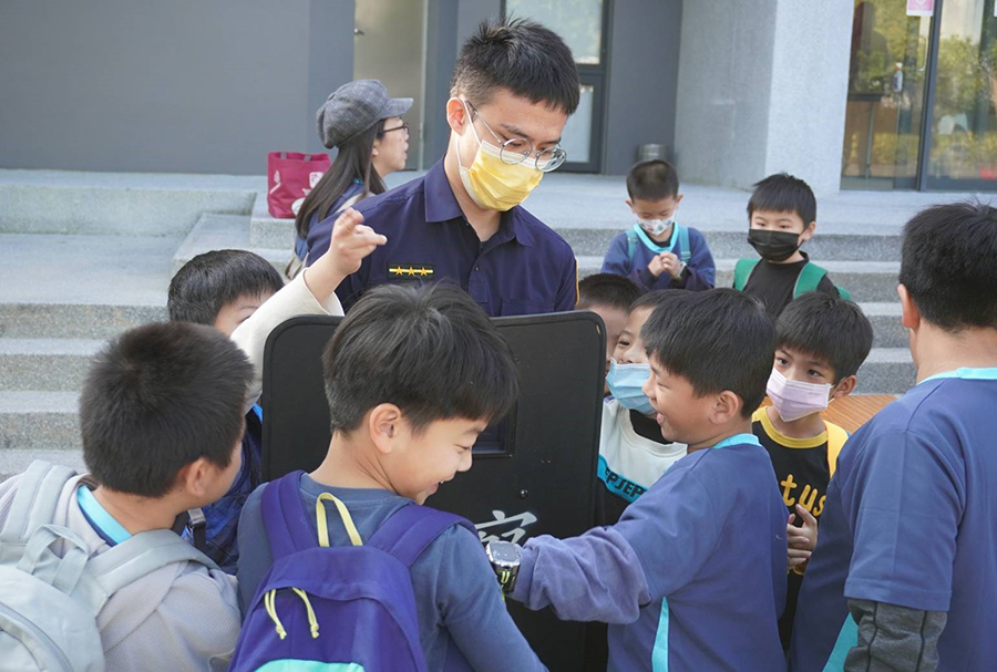 虎尾小隊小隊長沈昌逸親自帶領警員蘇靖、秦楷傑等同仁歡迎學生們的到來。警員們首先向小朋友介紹了他們日常執勤的方式,並展示了平時使用的各種警用裝備,包括警槍、無線電、警用行動電腦、酒測器、防彈衣、警棍、辣椒水和手銬等。學童們穿戴防彈衣、握持警棍進行合影的瞬間,表現出對各種裝備的濃厚興趣。