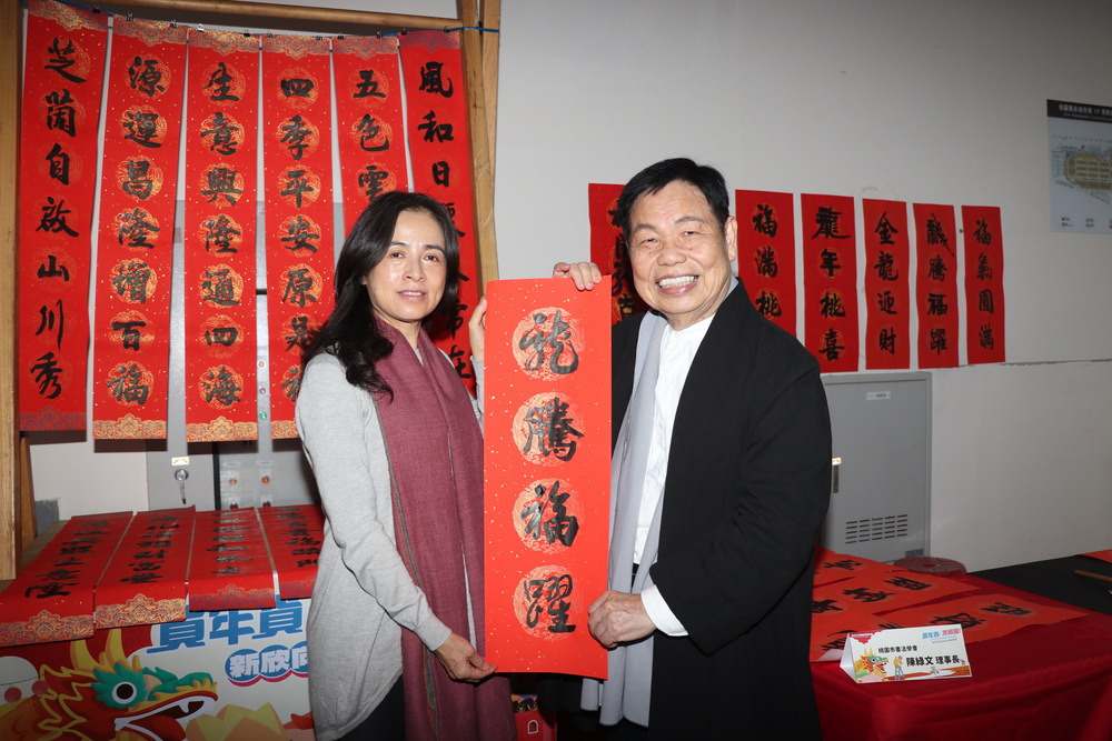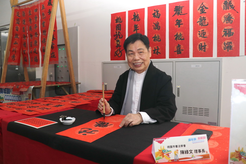 陳綠文表示,很高興受邀到桃園市政府首度辦理的年貨大街活動現場為民眾現場揮毫書寫春聯,看到現場充滿濃厚年味與創意,不只增添節慶熱鬧的氣氛,也加足我提筆揮毫的能量。因此,除了先前完成16個市場的對聯讓其張貼祝賀鄉親新年快樂外,也書寫「桃園龍真好」春聯送給張善政市長,以表達為政者經營都很好,大家都能共享幸福和喜氣。現場亦應民眾的需求書寫春聯攜回家張貼,希望能以書法藝術為鄉親帶來新年好兆頭、新氣象。