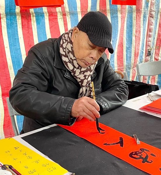 桃園市教育書法學會理事長黃慶章現場揮毫書寫春聯。(記者鍾陽正攝)