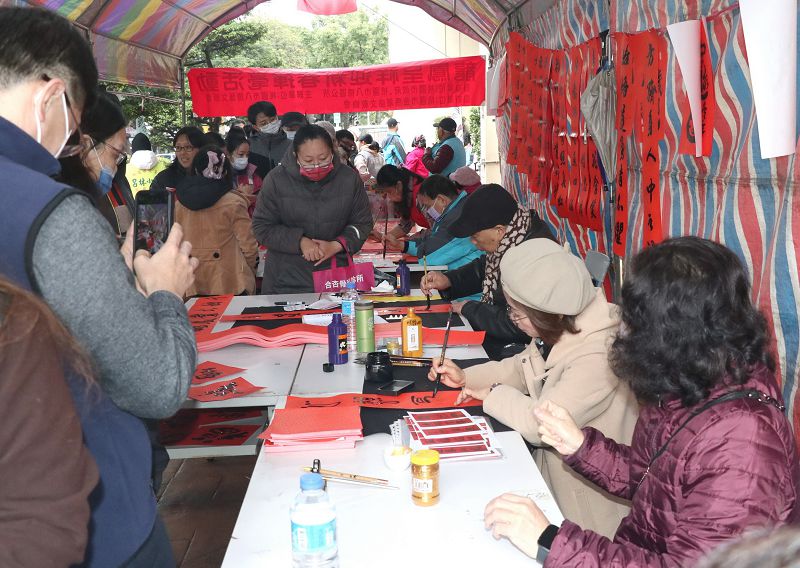 八德區公所揮毫贈春聯活動吸引許多鄉親排隊索取。(記者鍾陽正攝)
