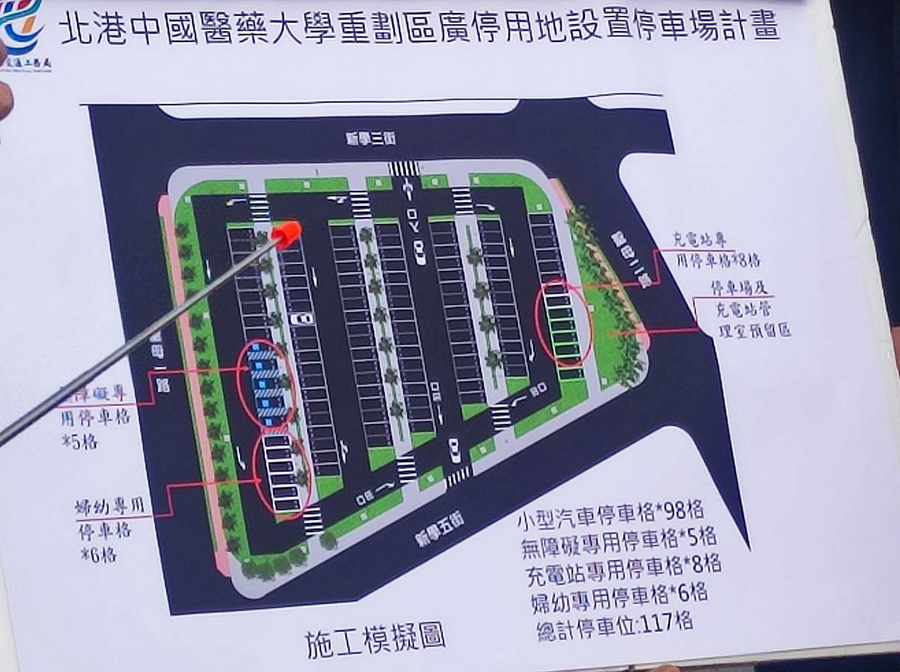 縣長張麗善指出,考量北港媽祖醫院市地重劃後能持續吸引新建案及周邊空間之發展,同時避免日後衍生路邊停車亂象影響交通及現有閒置空間再運用等因素,雲林縣政府將該重劃區廣停用地重新開發,盤點停車需求及進出動線規劃,初估斥資1,100萬元,規劃空間約4600平方公尺,預計設置小型汽車停車格98格、身心障礙專用車格5格、電動汽車充電專用停車格8格及孕婦、育有六歲以下兒童者專用停車格6格,共計117格停車空間。工程預計於113年2月底開工,工期總計120日曆天,完成後不僅能提供西側媽祖醫院及中醫大北港校區學生宿舍使用,減緩原有停車格數量不足問題,亦可作為北側舊河道公園及未來附近住商做使用。