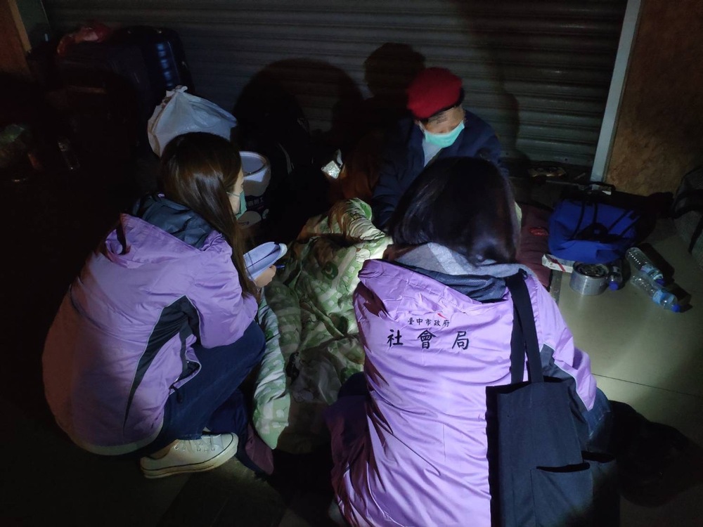 【記者彭勝郎台中報導】入冬最強寒流來襲,氣象署發布低溫特報,台中市為橙色燈號(非常寒冷)區域,22日至24日氣溫有10度以下的機率。台中市政府社會局連續3天啟動低溫關懷,遊民小組22日晚間至車站和公園等街友露宿區域發放禦寒物資,發現2名街友疑似失溫身體不適,立即通報119協助送醫治療。