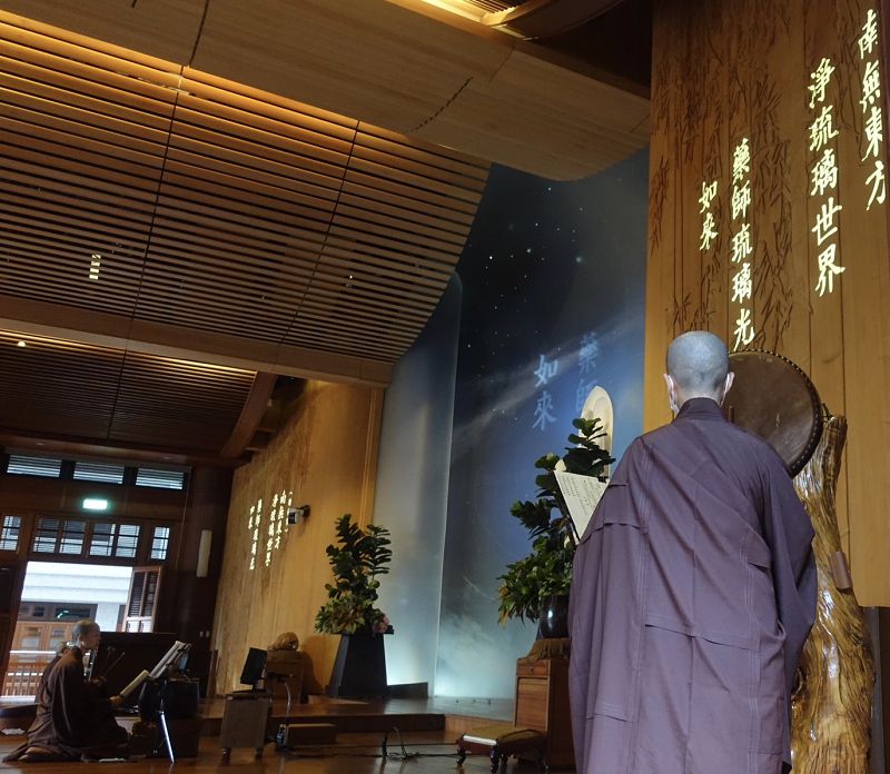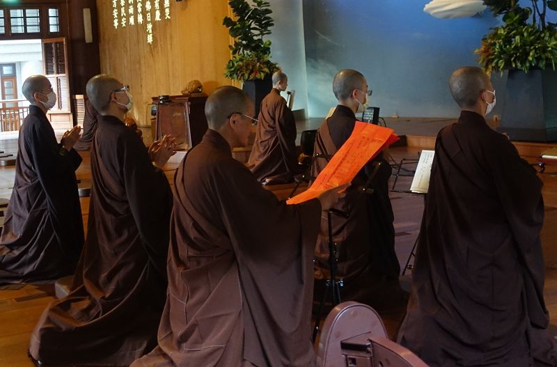 慈濟2月2日在靜思精舍舉辦冬令發放圍爐活動,藥師經法會上,法師帶領志工祈求平安。