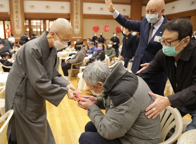 歲末寒冬,新北市三重區慈濟志工於慈濟三重志業園區舉辦「冬令發放暨歲末祝福活動」,邀請照顧戶共同為新的一年祈福平安順遂,志工為報到的照顧戶別上名牌,以便讓各桌的桌長能照顧到每一位的需要,儘管天寒,依然有一百四十三人參與活動。郭義聖很早就到,他將竹筒中每天存的零錢投入捐款功德海中,希望自己也能成為手心向下助人的人。
